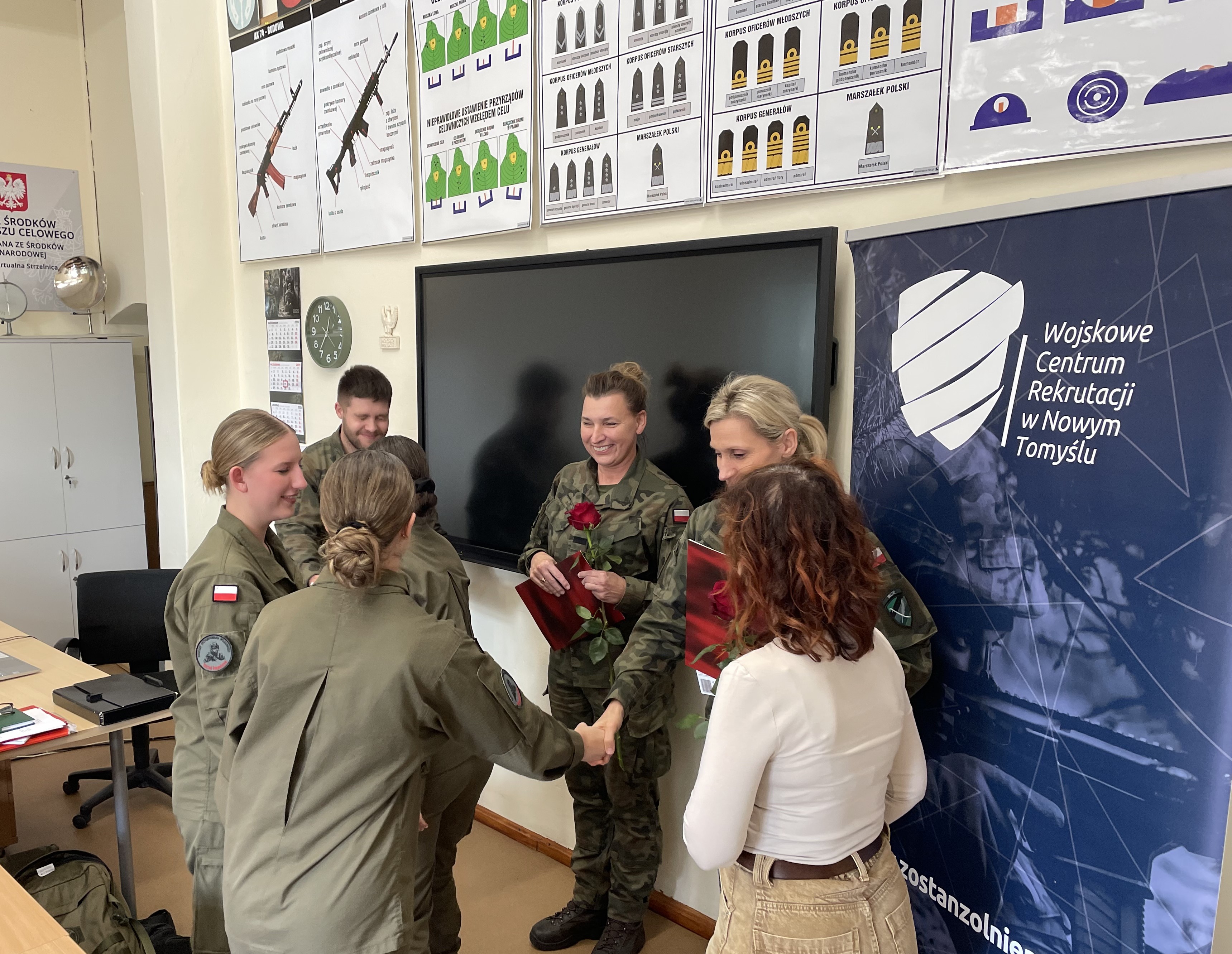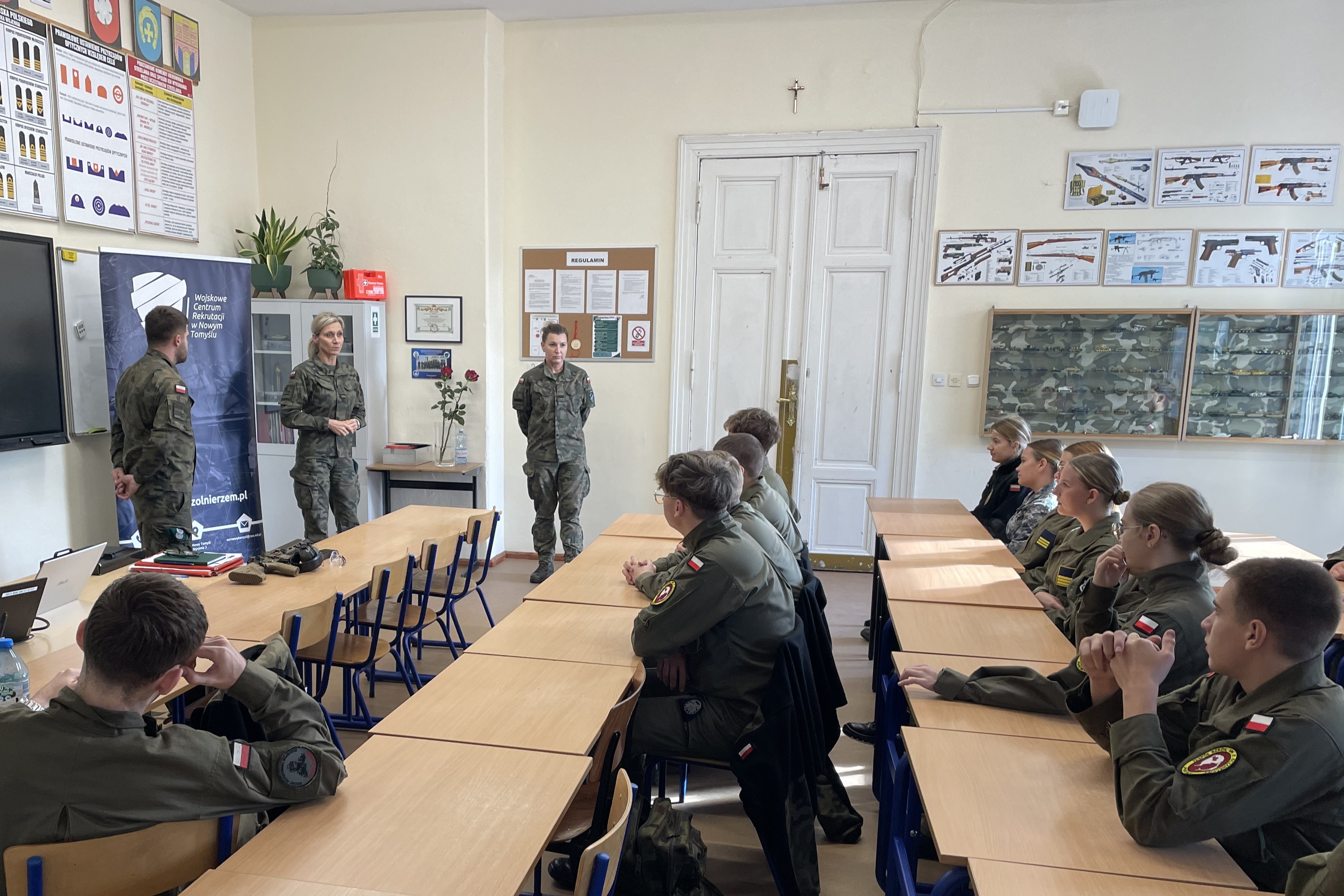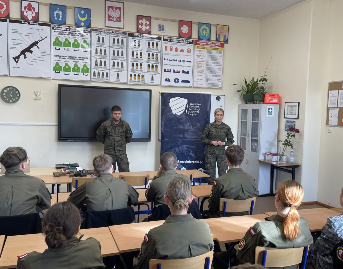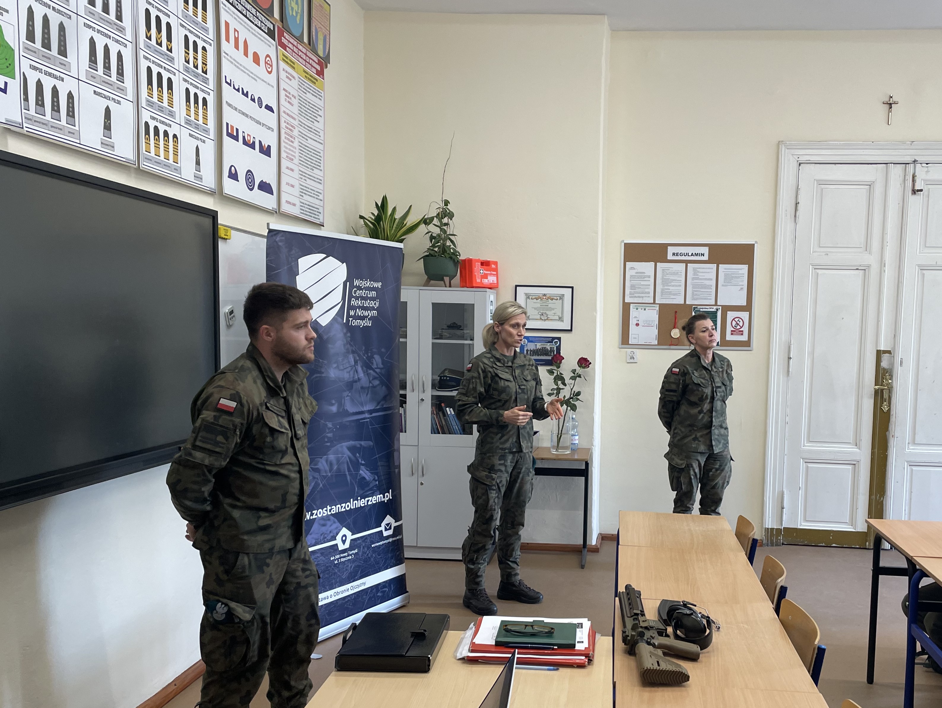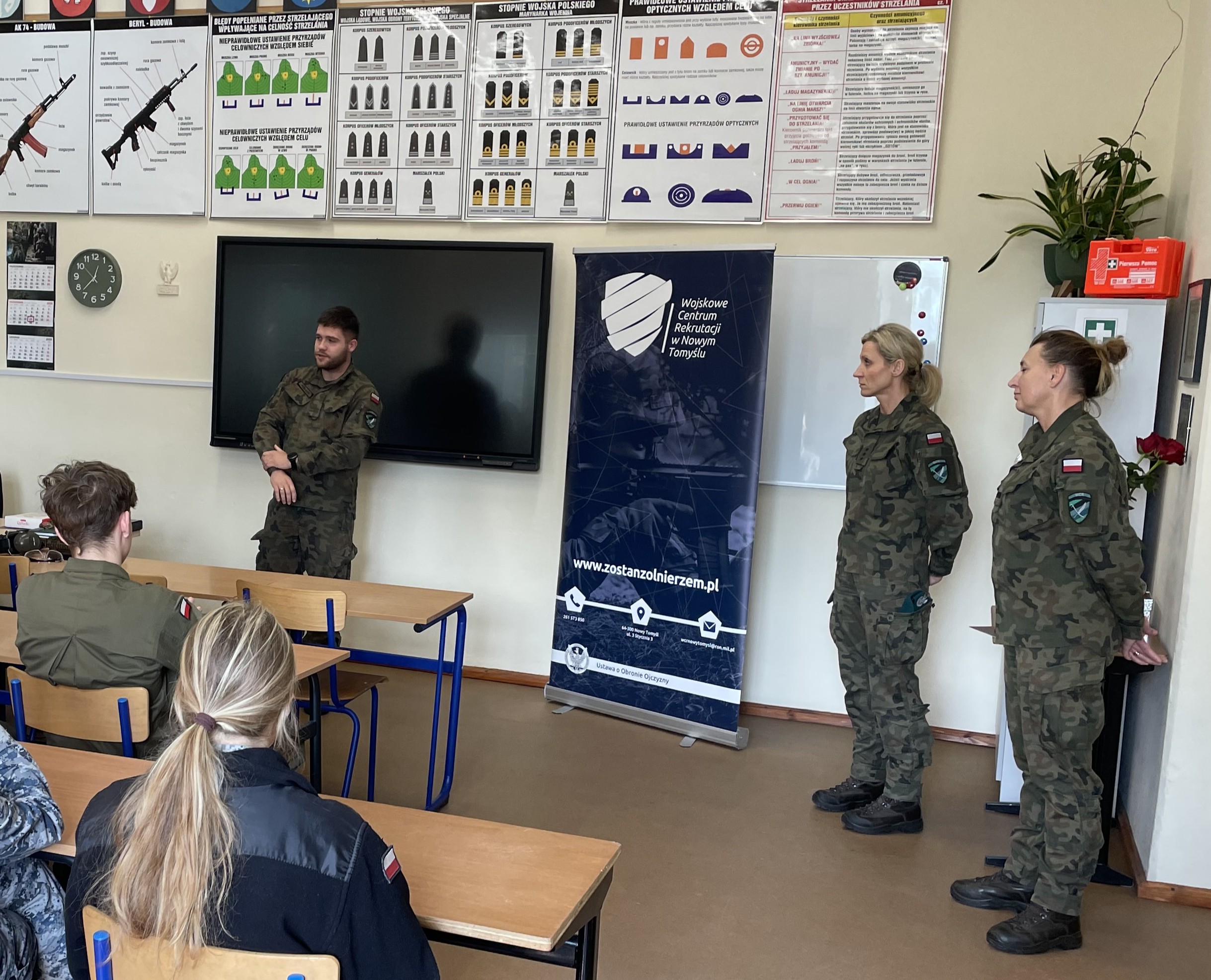 W czwartek 23 października na zajęciach szkolenia wojskowego kadeci z klasy III i IV mieli okazję spotkać się z żołnierzami nowotomyskiego Wojskowego Centrum Rekrutacji. Na spotkanie przybyli p. por. Dorota Kostańska z podwładnymi – p. kpr. Sławomirem Sobańskim i p. st. szer. spec. Romą Bąbelek.