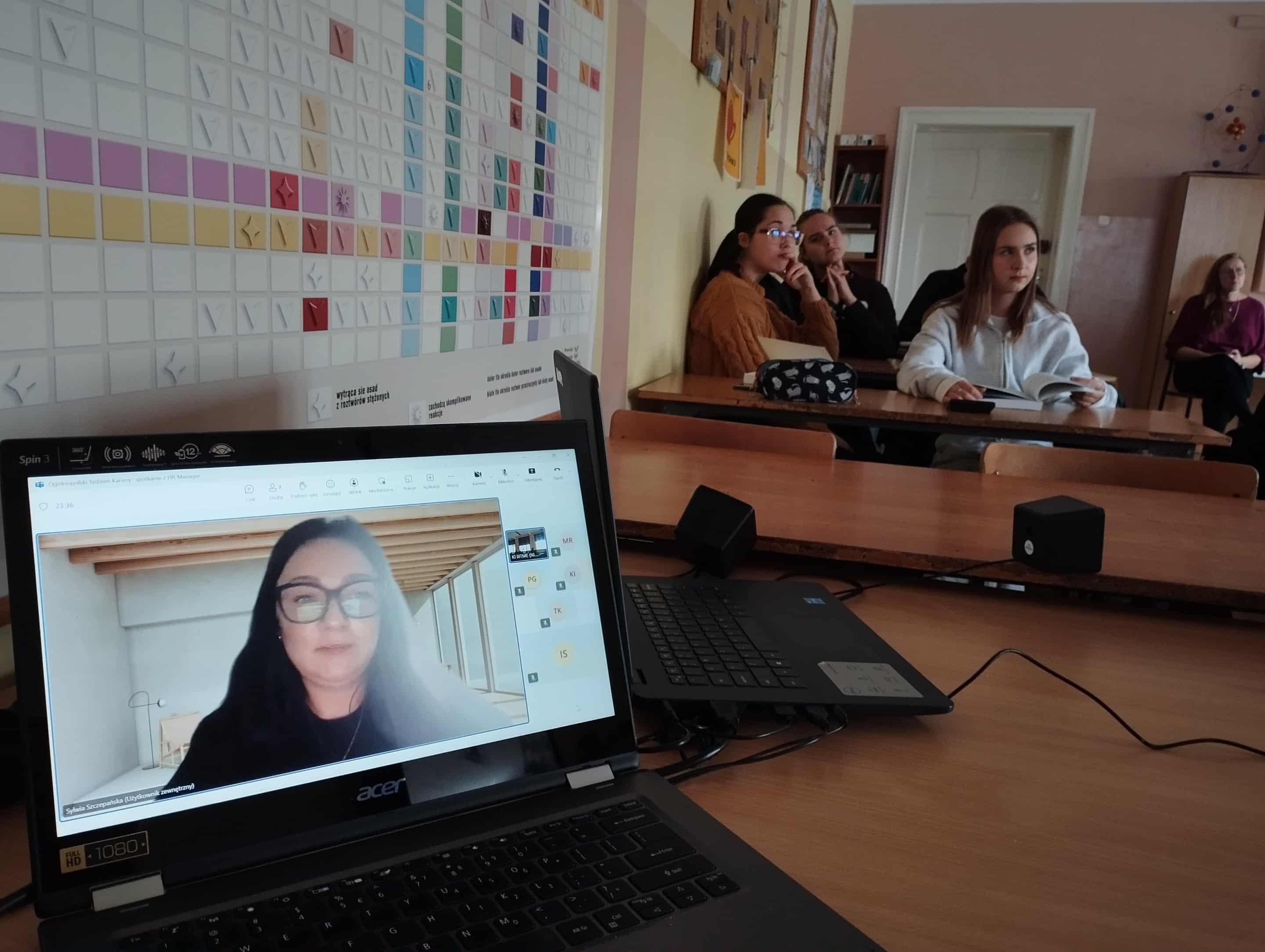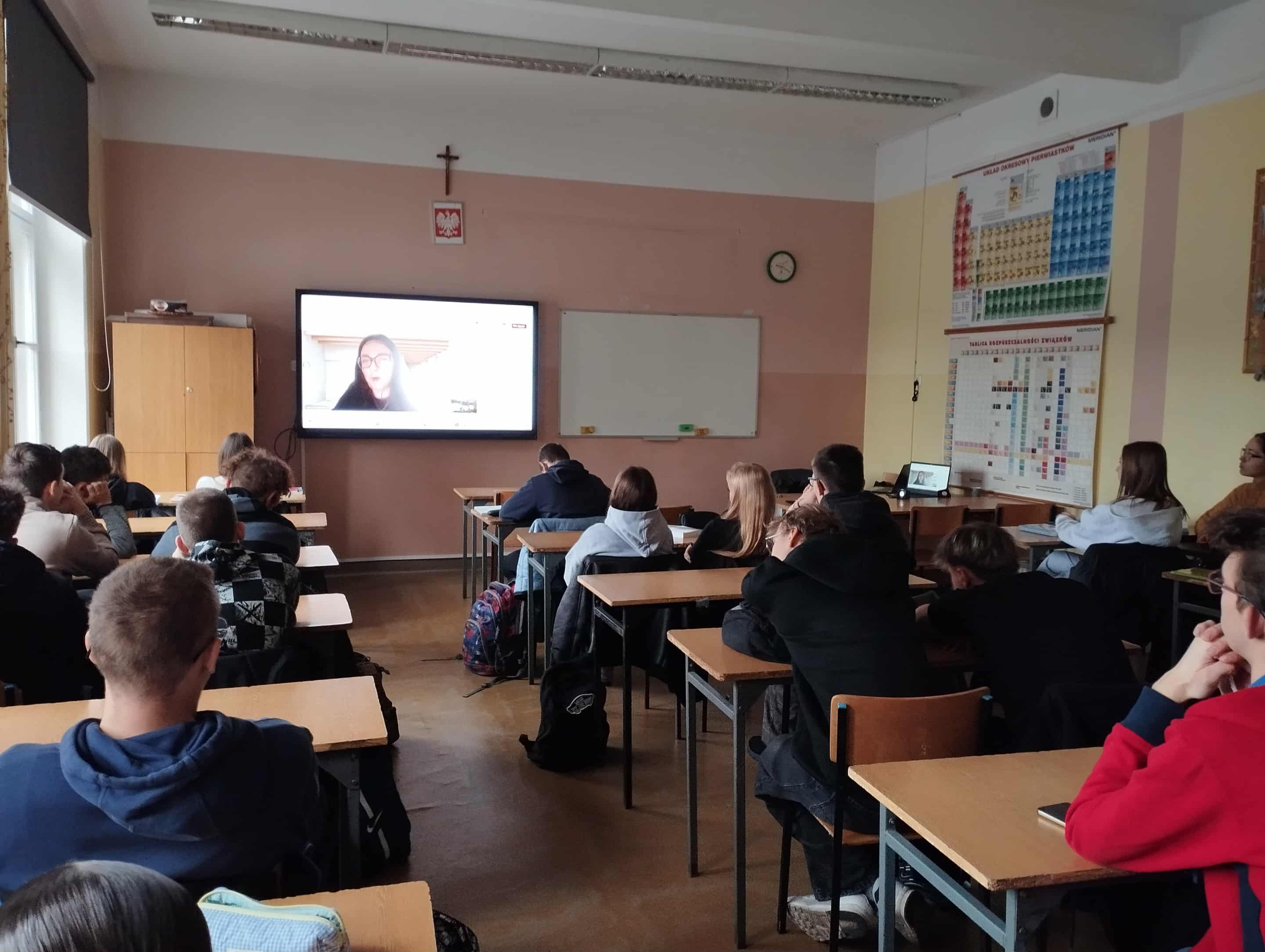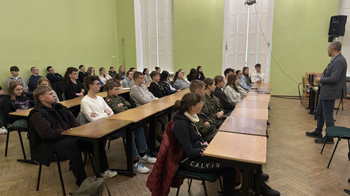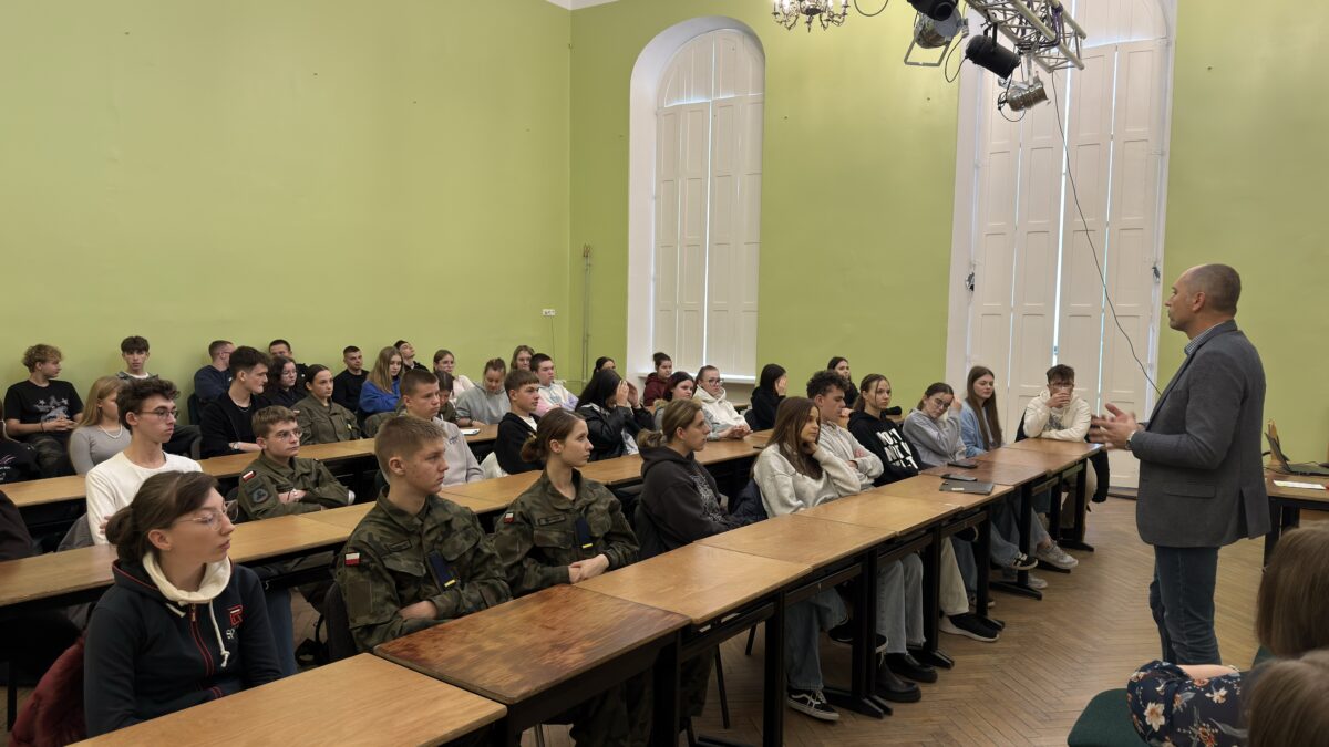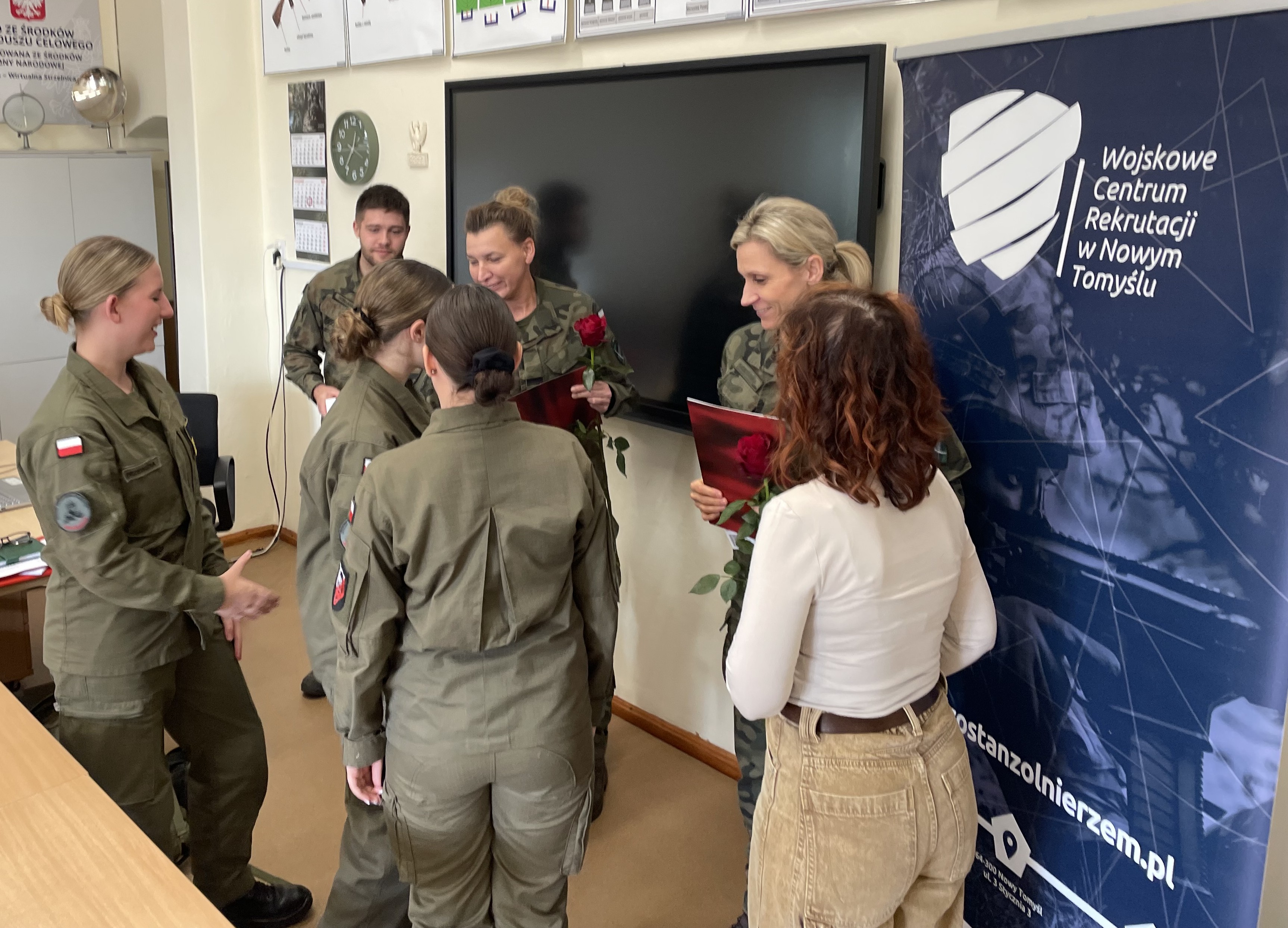 W czwartek 23 października na zajęciach szkolenia wojskowego kadeci z klasy III i IV mieli okazję spotkać się z żołnierzami nowotomyskiego Wojskowego Centrum Rekrutacji. Na spotkanie przybyli p. por. Dorota Kostańska z podwładnymi – p. kpr. Sławomirem Sobańskim i p. st. szer. spec. Romą Bąbelek.
